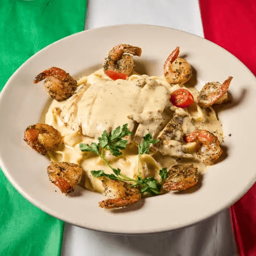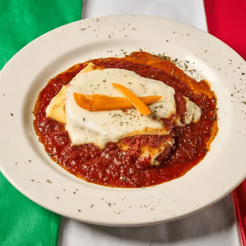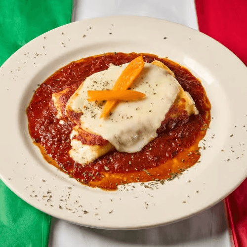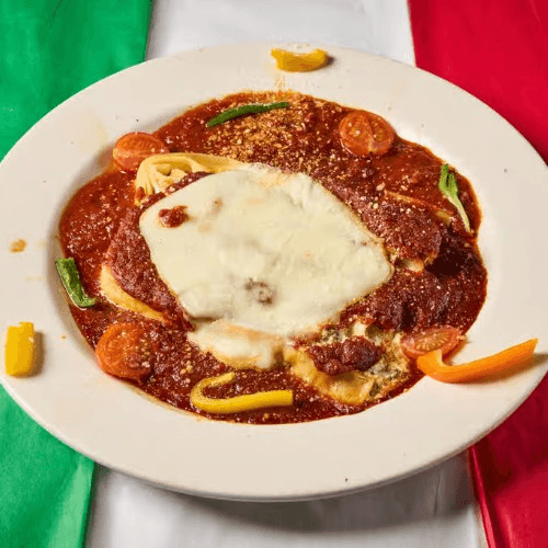 Breaded chicken with tomato sauce, house shredded mozzarella cheese, served with a side of Fettuccine Alfredo.
