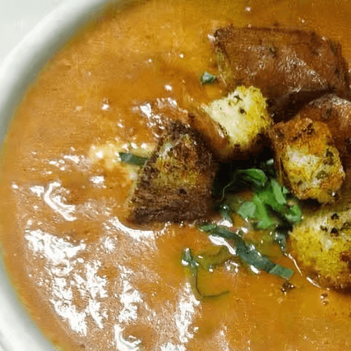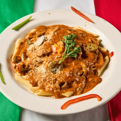 Bell peppers, onions, jalapeños, mushrooms in a spicy pink sauce