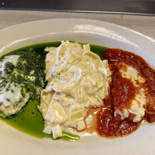 Lobster Ravioli, in a Pesto Sauce, Fettuccine Alfredo, Chicken Parmesan in Marinara Sauce
